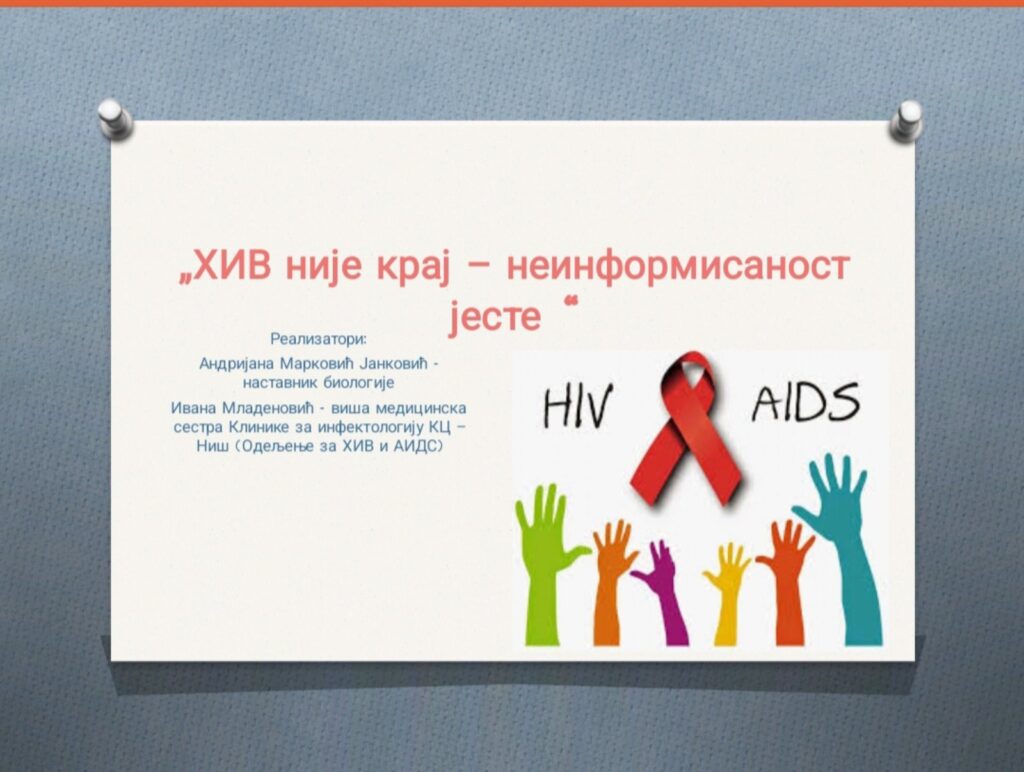 Поводом обележавања 1. децембра, Светског дана борбе против ХИВ/АИДС-а, данас су ученици седмог и осмог разреда и чланови Ученичког парламента учествовали на радионици “ХИВ није крај – неинформисаност јесте”. Радионица је одржана у Регионалном центру за стручно усавршавање са циљем да ученици разумеју шта је ХИВ вирус и СИДА као болест, разликују истине и заблуде о ХИВ/СИДИ, покажу емпатију и толеранцију према особама које живе са ХИВ-ом, а као резултат групног рада ученици су припремили плакат који ће бити окачен у холу школе.